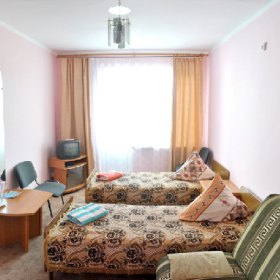 2-х комнатный номер: в спальной комнате две односпальные кровати, кондиционеp, в холле диван, холодильник, спутниковое ТВ, душ, сан. узел (максимум 4 человека, жилая площадь=17 кв.м.)